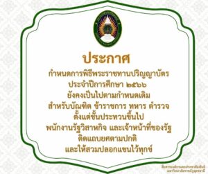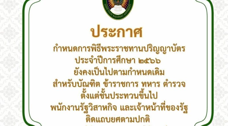 ขอแจ้งให้บัณฑิต มหาบัณฑิต และดุษฎีบัณฑิต รวมถึงผู้ที่เกี่ยวข้องทุกท่านทราบว่า กำหนดการพิธีพระราชทานปริญญาบัตรของมหาวิทยาลัยราชภัฏเขตภาคตะวันออกเฉียงเหนือตอนบน ประจำปีการศึกษา 2566 ยังคงเป็นไปตามกำหนดการเดิมที่ได้ประกาศไว้ และจะไม่มีการเปลี่ยนแปลงใดๆ ทั้งสิ้น