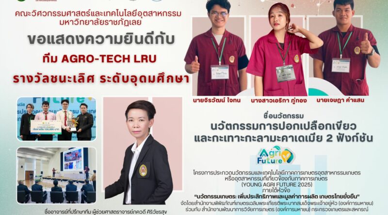 ข่าวประกวด แข่งขันข่าวประชาสัมพันธ์ 08/12/2025 ภัทราภรณ์ เขียวทองสี ทีม AGRO-TECH LRU คว้ารางวัลชนะเลิศ ระดับอุดมศึกษา นวัตกรรมการปอกเปลือกเขียวและกะเทาะกะลามะคาเดเมีย 2 ฟังก์ชัน รางวัลชนะเลิศ ระดับอ Read More